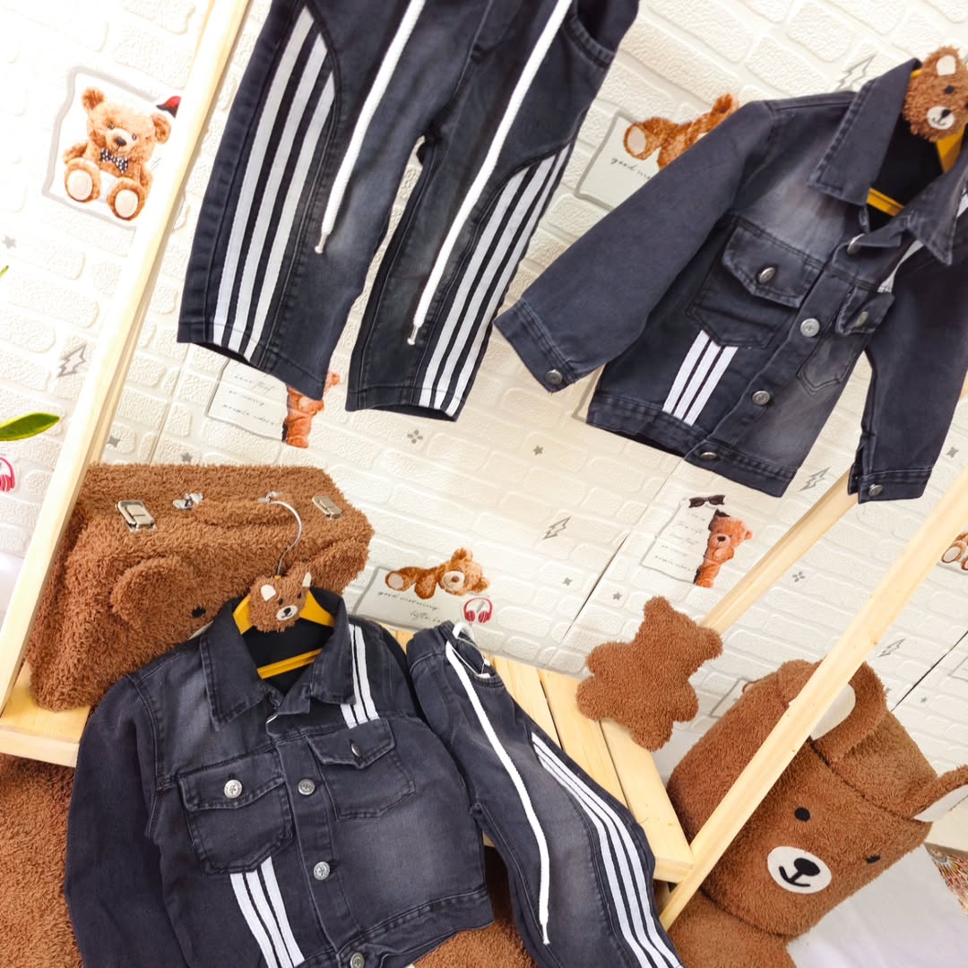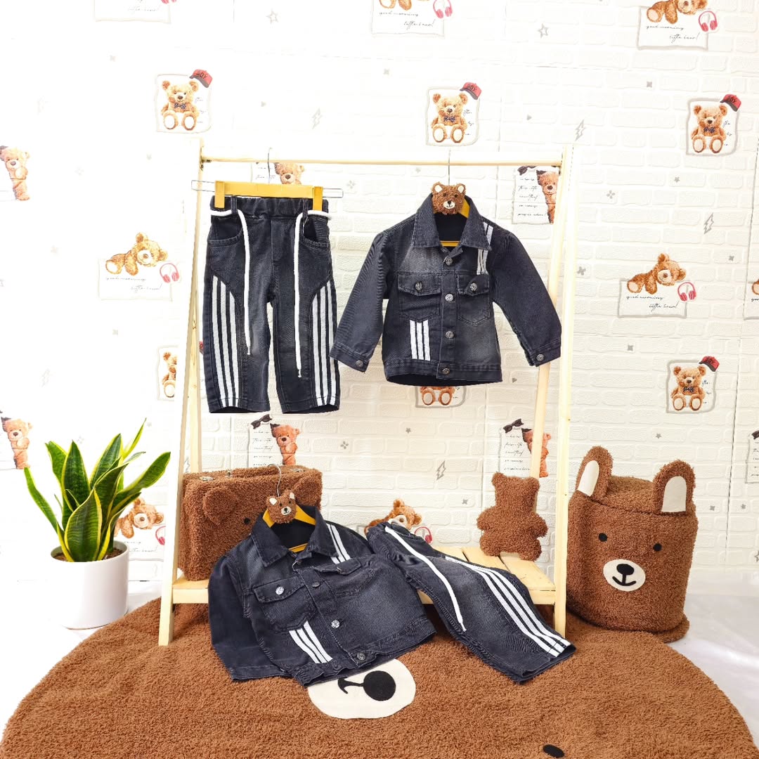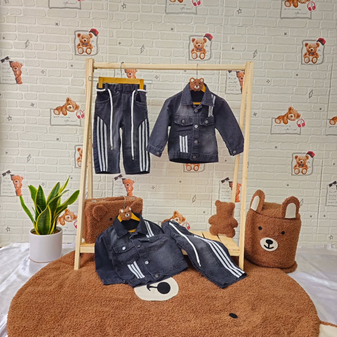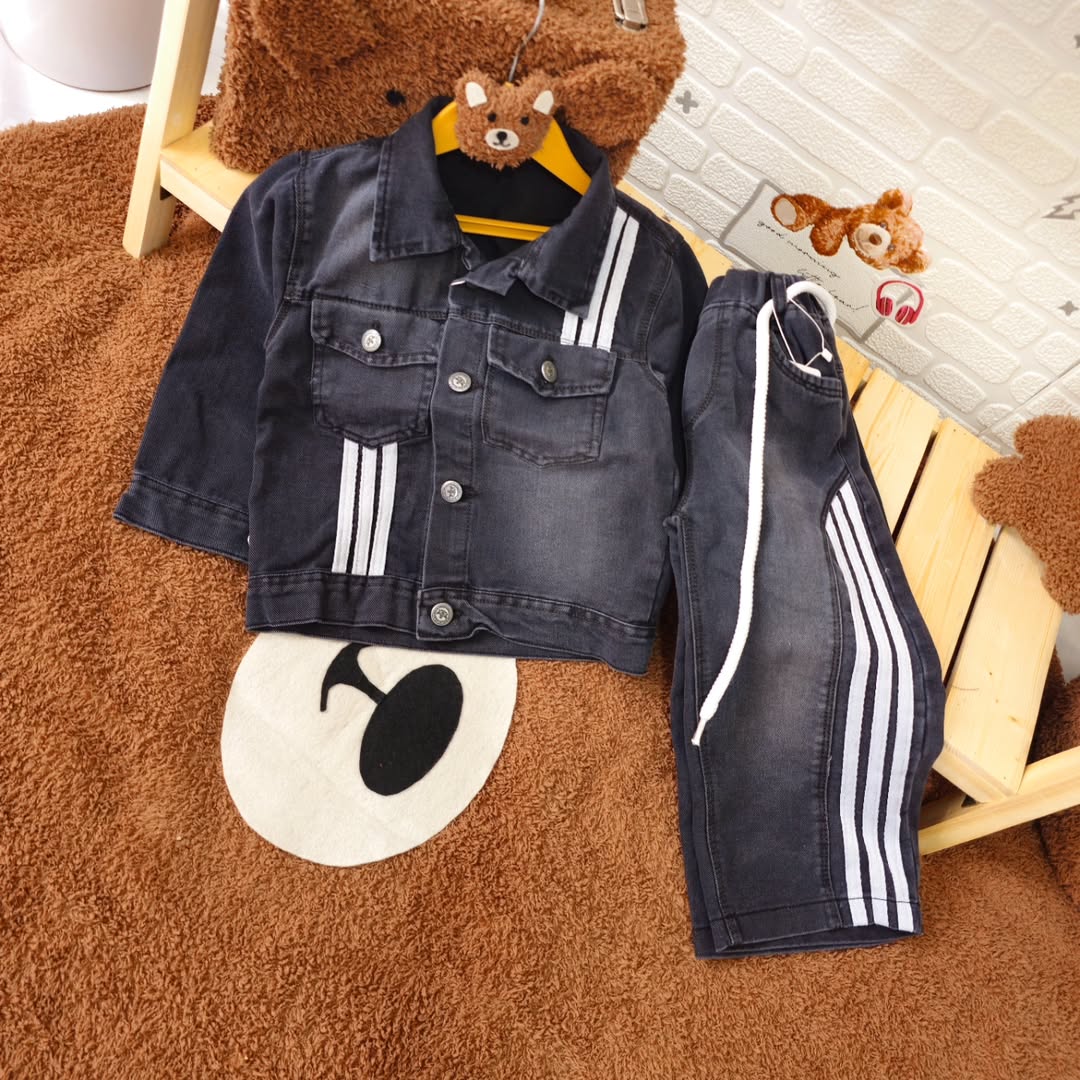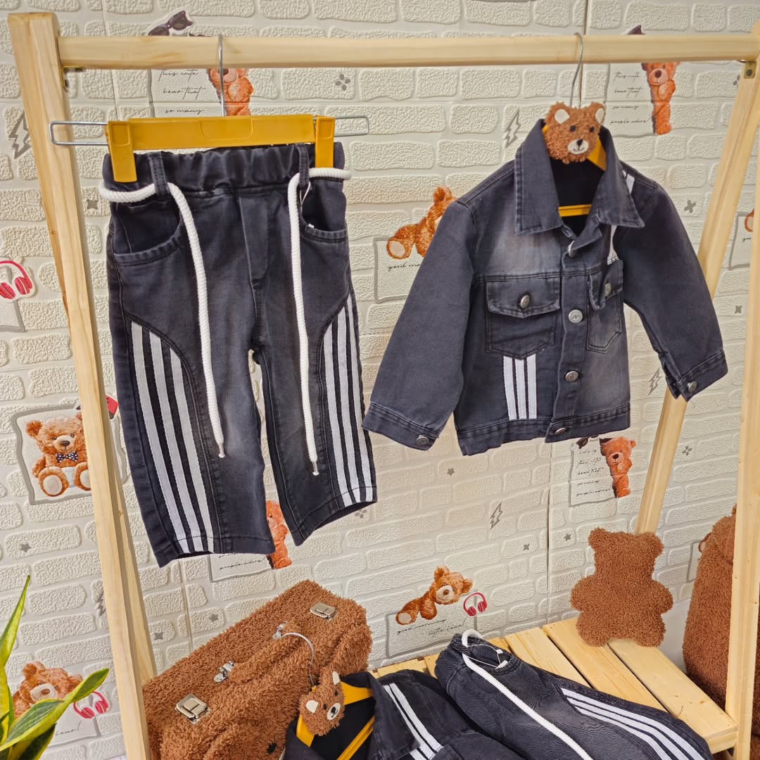 ست جین عیدانه کت و شلوار سه خط بگ سایز:۵۰_۵۵_۶۰_۶۵_۷۰_۷۵ مناسب سن۱تا۷سال رنگ زیبای:زغالی